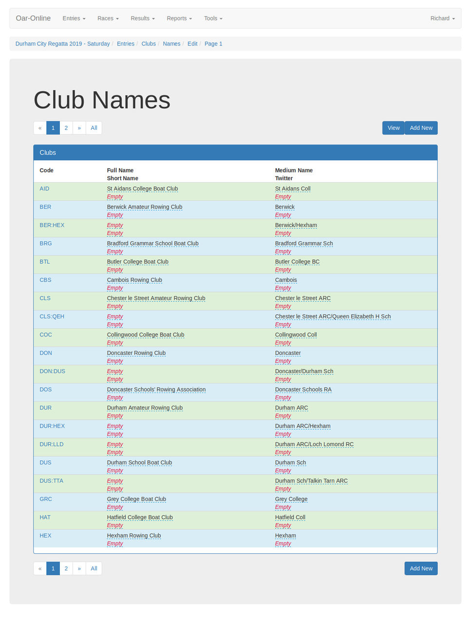 Provide a short name for any clubs that have longer names. This will be automatically used where the combination of crew name and club name approaches/exceeds the space available in a report.