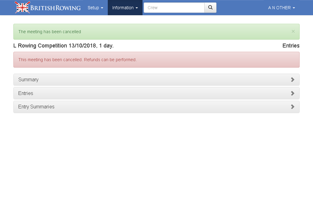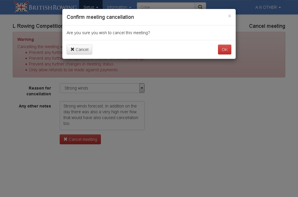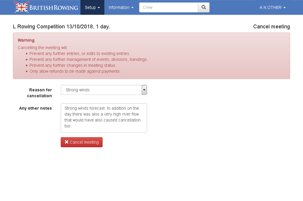 Once confirmed the meeting will be cancelled and no further edits are allowed. Refunds can still be made for a few days before British Rowing will perform the final payments balance.