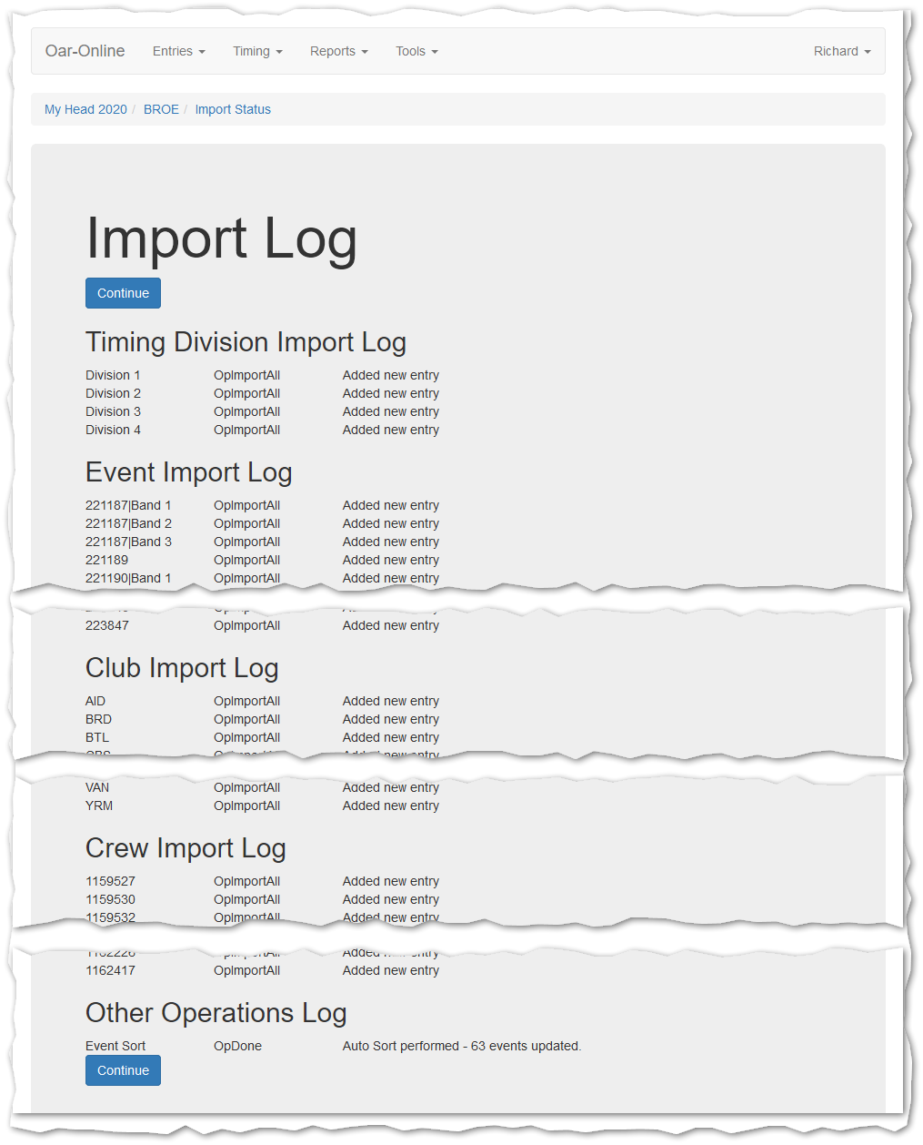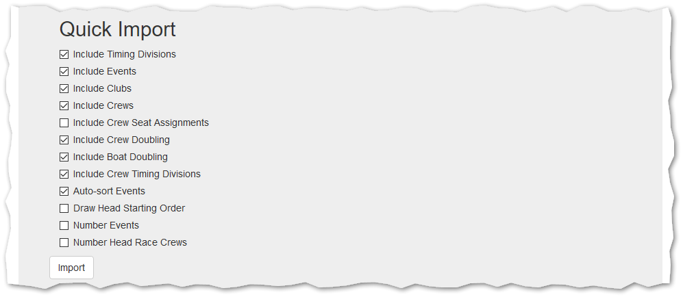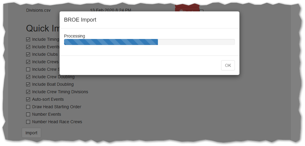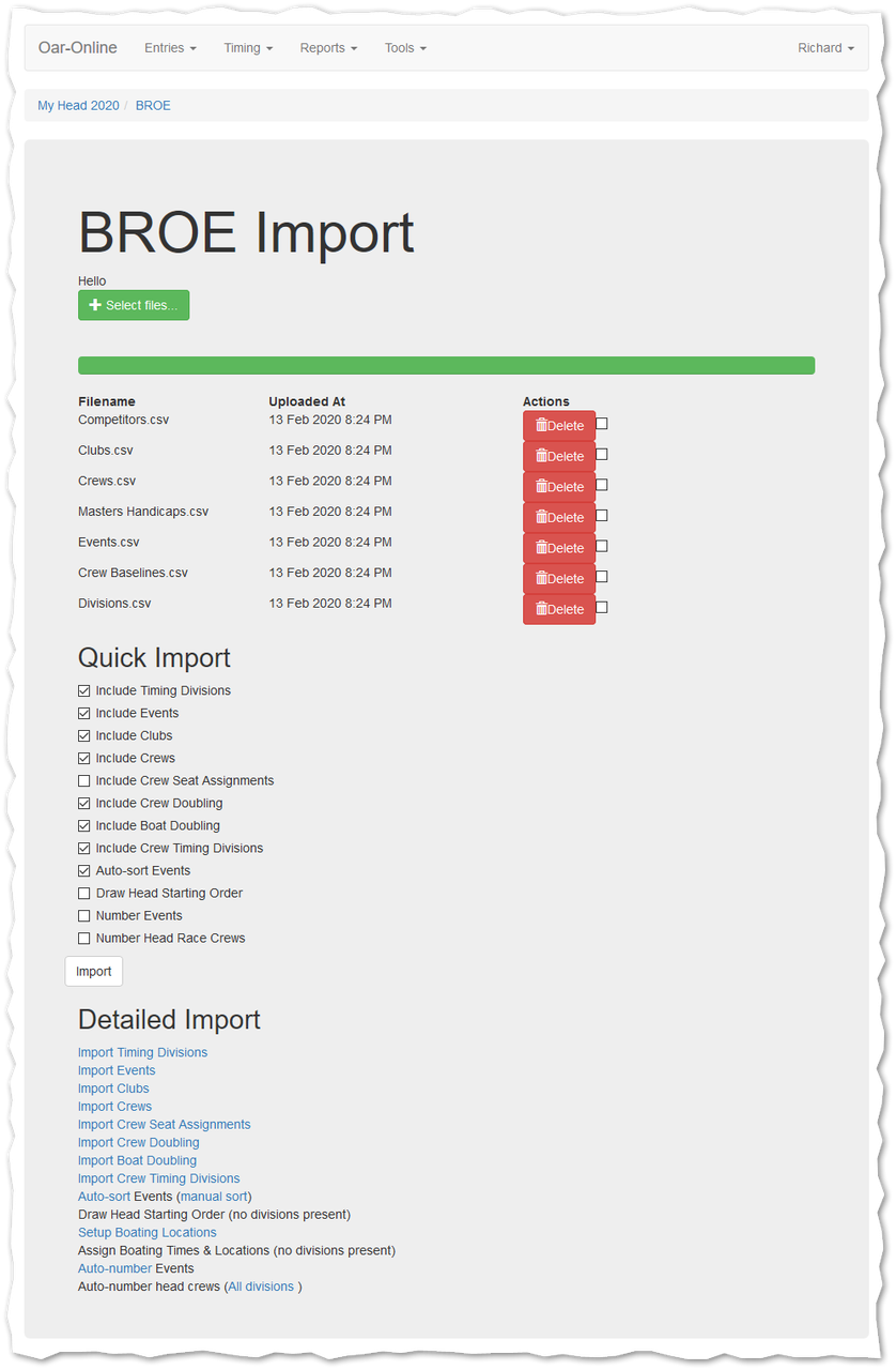 The usual method of import is to use the Quick Import feature. This pulls in all active clubs, events, crews and similar from the BROE .csv files. The actual data imported can be selected by ticking the relevant checkboxes but in general items that appear earlier in the list are required before later ones.