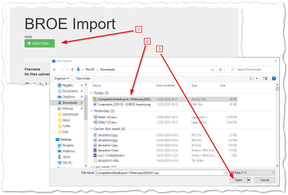 First download the .zip file from BROE and then select Select files on the Oar-Online import screen. Once uploaded the .zip file will be analysed and all relevant file contents will be stored ready for data import.