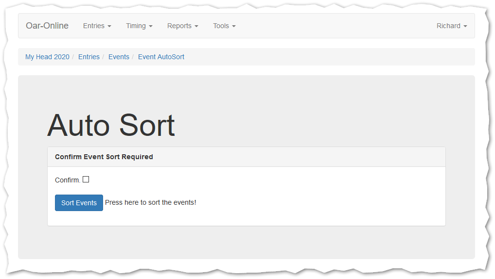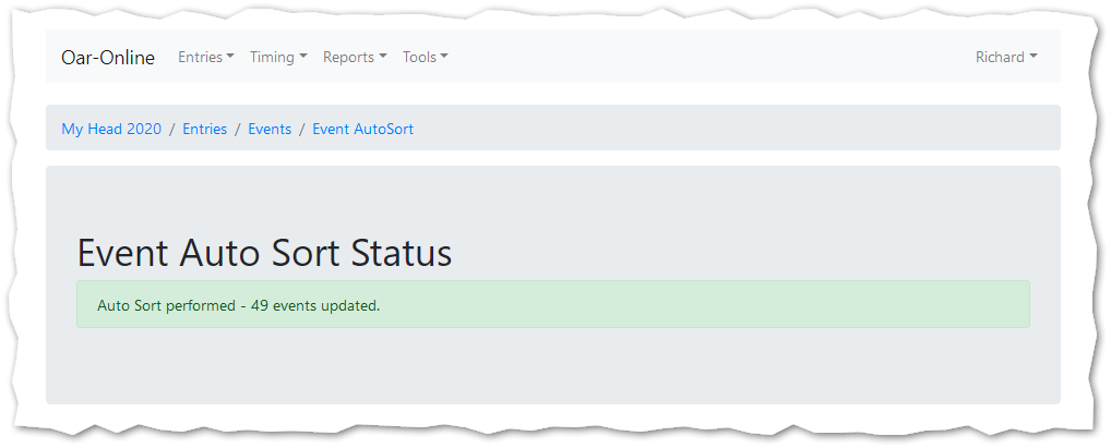 To perform an auto sort check the Confirm box and click Sort Events. Once clicked the sort will be performed and a status screen will summarise any changes made.