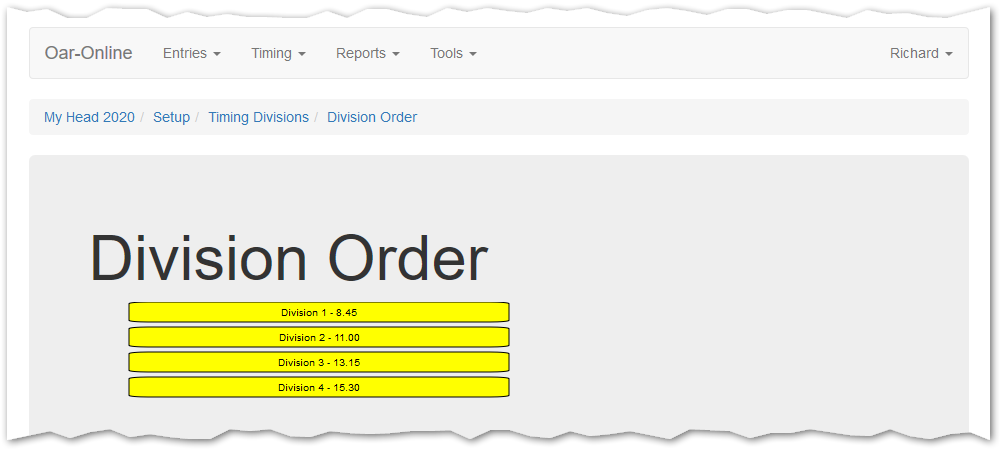 The order that divisions appear can also be adjusted. To do this click on Re-Order Divisions. On this screen the divisions can be dragged and dropped to re-arrange the order. Once re-ordered any reports that contain multiple divisions will show the divisions in the new order.