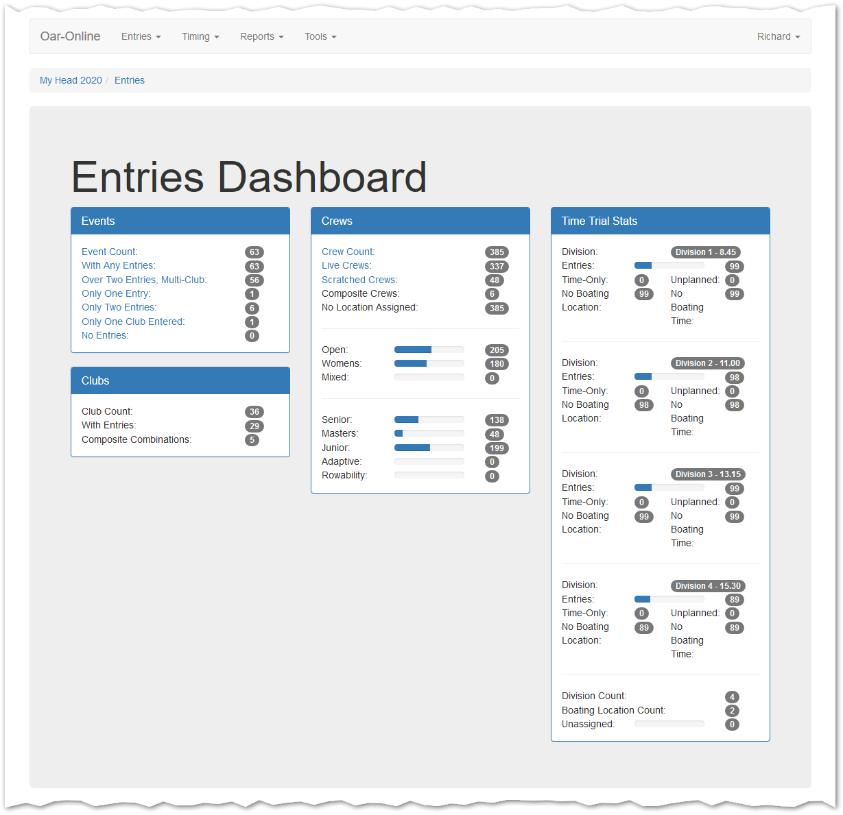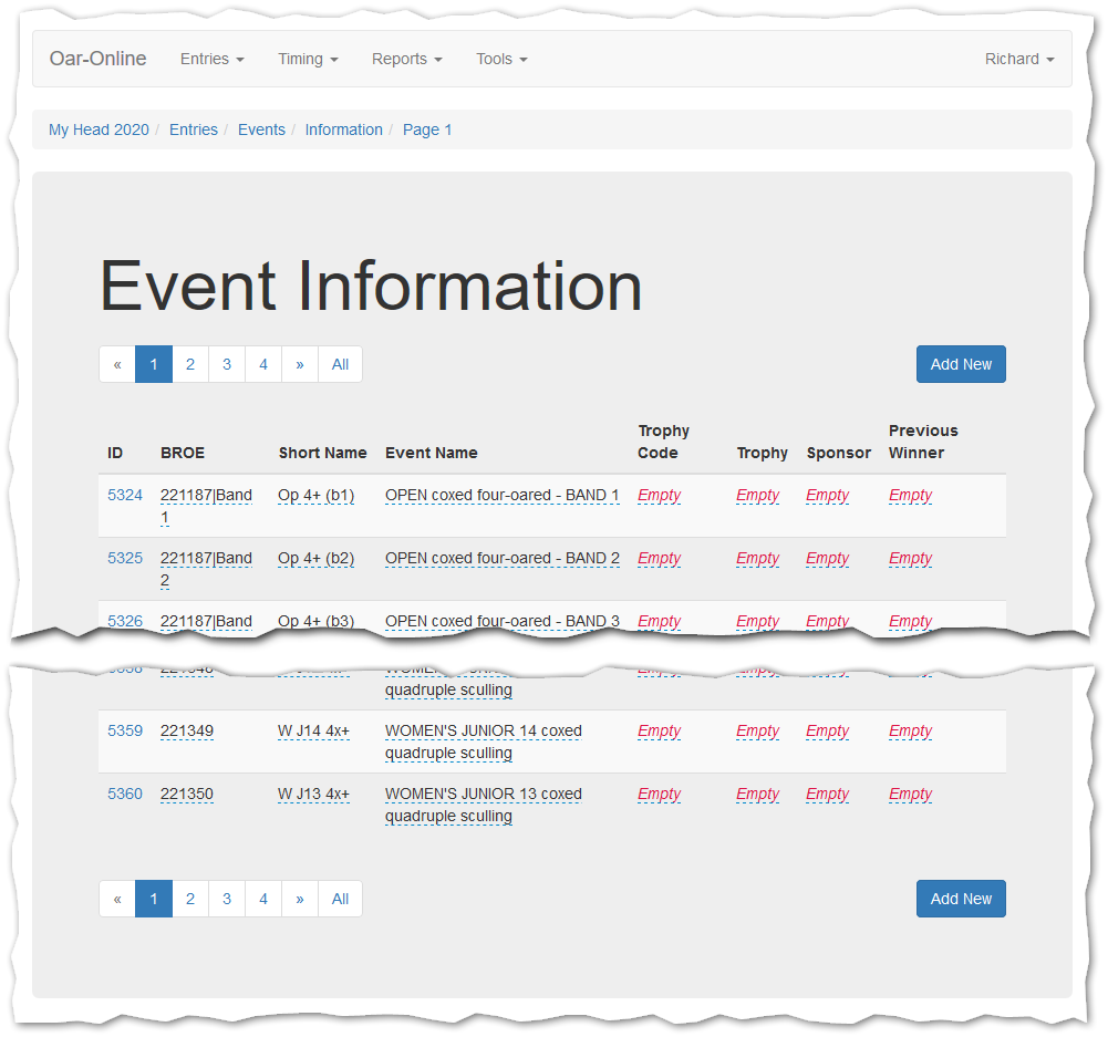 Typically only needed for some Regatta competitions but Trophies, Previous Winners, Sponsors and long event names can be setup in addition to the basic event information that is used for head races. Visit Entries -> Event Key Information to update this data.