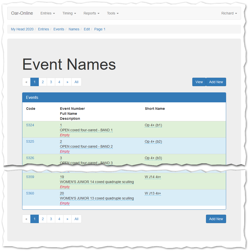 Event names also often require a small amount of tweaking via Entries -> Event Names , The short name is used in start-orders, running orders and similar. The full name is used in regatta draw reports. Similarly the description is a more wordy version that is used in some regatta draws.
