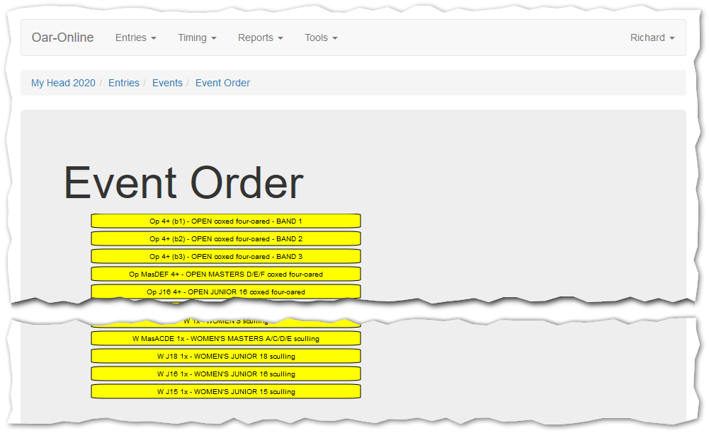 Access the Event Order screen via the Entries -> Event Order menu entry. Once on the screen the event order can be changed by drag and drop