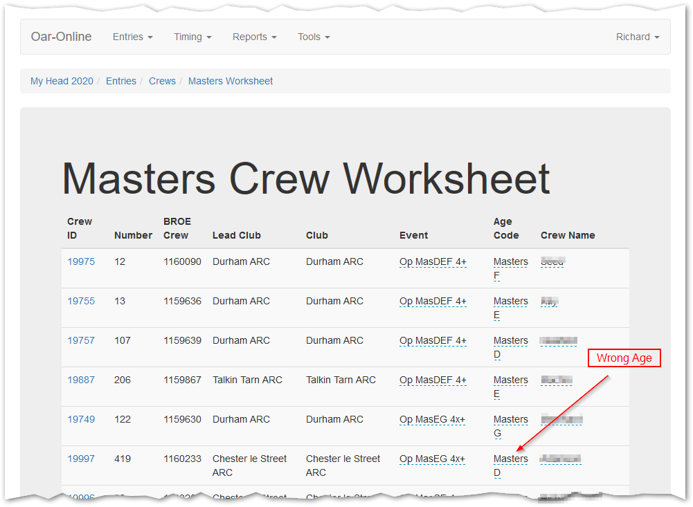 Click on the Age Code for any that are wrong and choose the correct age code for the crew from the list that is presented.