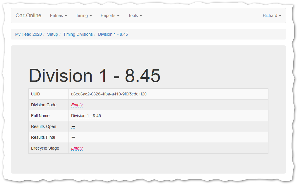 Divisions have two aspects that need checking via Tools -> Setup -> Timing Divisions (head races) or Tools -> Setup -> Draw Divisions (regattas) First check that a suitable code has been assigned to the division. These codes are mainly cosmetic and typically will be set to something like div1 or similar.