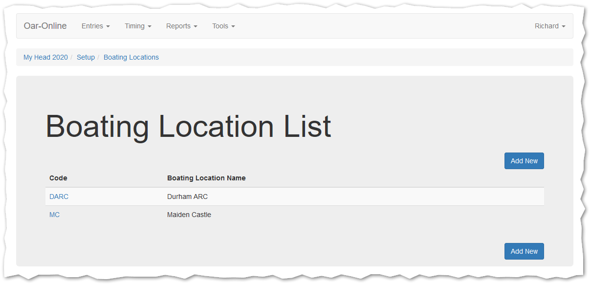 Boating locations are identified by a short alpha-numeric code and then by a name/label. The space on the draw is limited for these so it is important to ensure that they are concise to fit on the reports. View/Edit boating locations via the Tools -> Setup menu but specifically at the Tools -> Setup -> Boating Locations page.