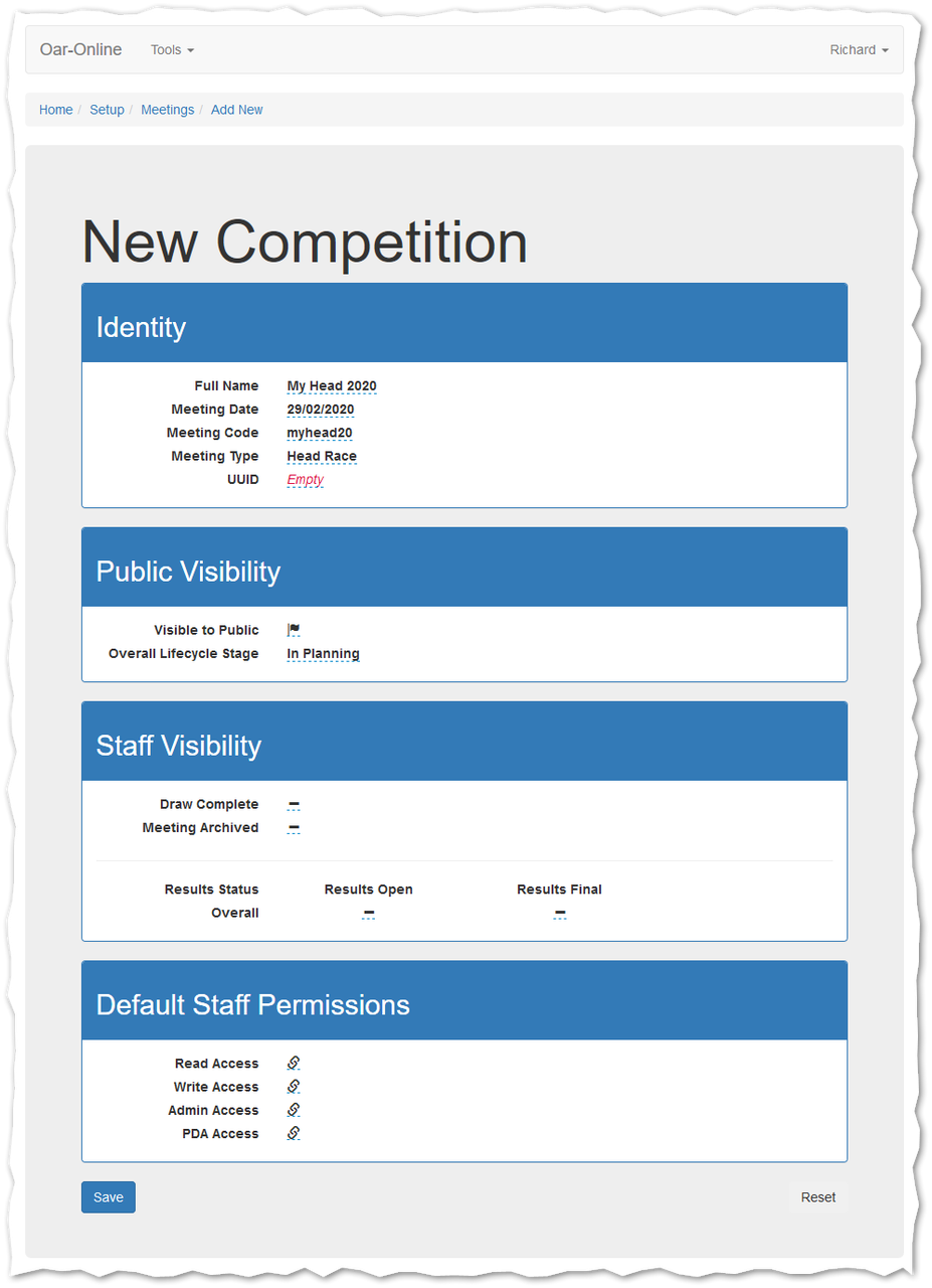 Once the initial setup has been performed click Save to go ahead and create the competition meeting.