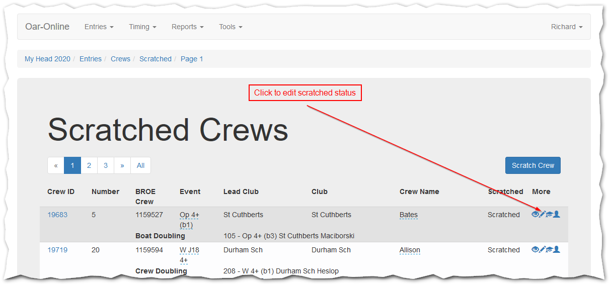 Crew scratchings are a fact of life for the competition organiser. Recording these is desirable to ensure that results are properly recorded and to aid informing opposition, especially in side-by-side racing.